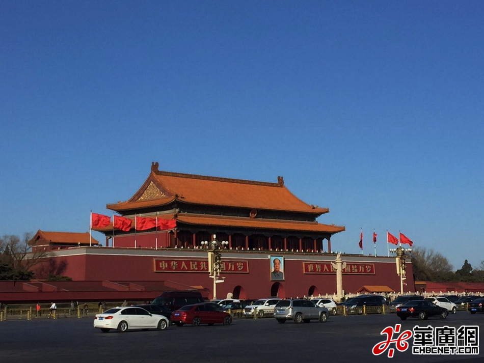 藍(lán)天下,天安門城樓莊嚴(yán)肅穆,靜待全國(guó)兩會(huì)開(kāi)幕。陶寧薇攝