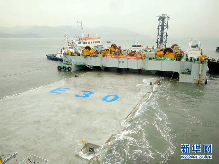 施工方將最后一節(jié)沉管運至指定區(qū)域(3月6日攝)。3月7日,港珠澳大橋海底隧道最后一節(jié)巨型沉管——E30管節(jié)安裝成功,軸線、縱坡、艏艉高差等各項關鍵指標均滿足設計標準。至此,體量超大的33節(jié)沉管全部安裝完畢,港珠澳大橋已建隧道總長5652米,距最終合龍僅差12米。新華社記者周強攝