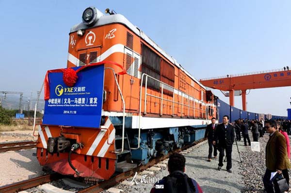 2014年11月18日,“中歐班列(義烏-馬德里)”首班從義烏鐵路西站啟程,全程13052公里,運行時間約21天。圖片來源:人民網