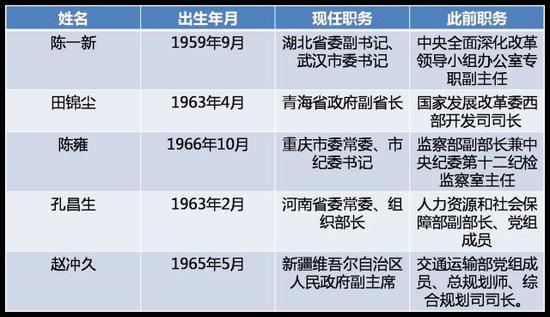 從中央到地方任職的5人中,4人為“60后”,2人為“65后”。其中,最年輕的是重慶市委常委、紀(jì)委書記陳雍,51歲,此前擔(dān)任監(jiān)察部副部長(zhǎng)。