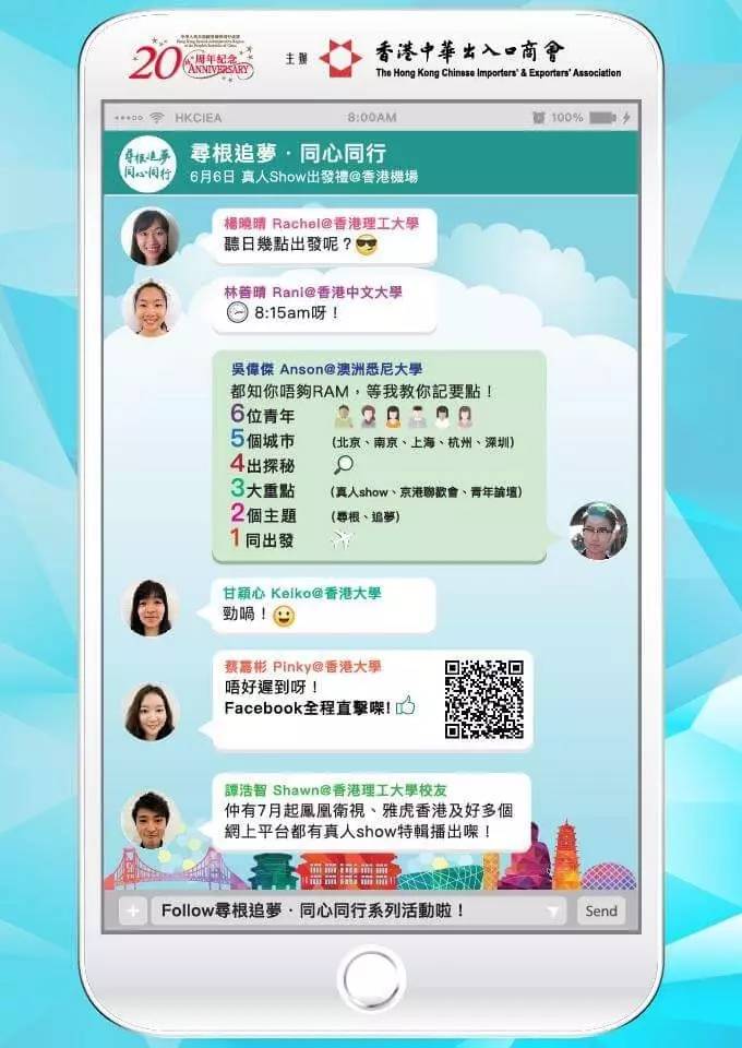 據悉,該活動為中出慶回歸廿周年系列活動的重點項目,籌備歷時半年,以真人騷形式進行,特別安排專業攝製團隊跟拍活動全程,邀請了6位不同背景的香港青年圍繞“尋根”、“追夢”的主題,游歷北京、南京、上海、杭州及深圳五個城市,廣泛接觸在內地工作、創業、學習的香港青年,用香港青年的眼光看中華民族的歷史與民間風俗,了解內地的經濟發展和今昔變遷。