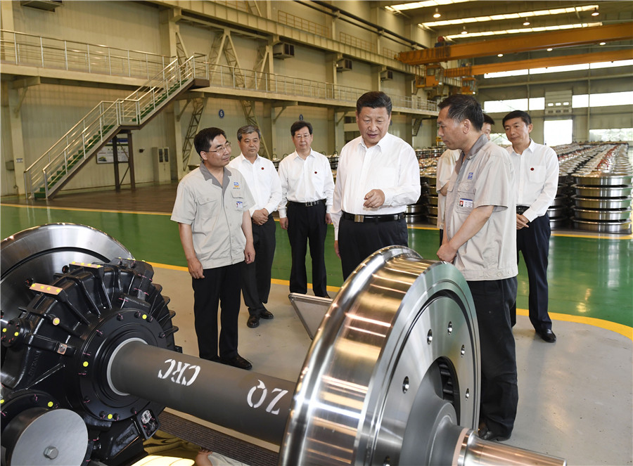 6月22日,習近平總書記在太原考察了兩家企業。太原重工軌道交通設備有限公司車輪車間機聲隆隆,熱軋生產線上鋼坯燒得通紅。總書記沿著高空走廊察看高鐵車輪生產流程,了解企業提升軌道交通裝備研發、設計、制造能力的情況。習近平還考察了盾構機生產裝備情況,觀看了山西省自主創新成果展示。在山西鋼科碳材料有限公司,總書記同職工親切交流,勉勵他們發揚工匠精神,為“中國制造”作出更大貢獻。