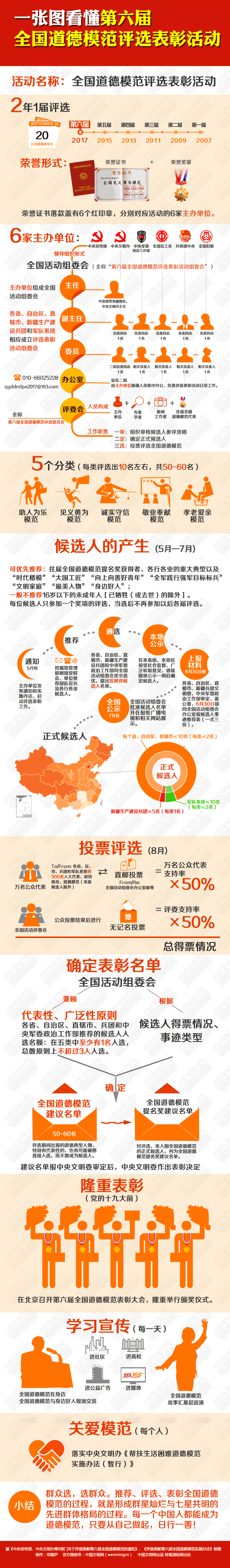 中央宣傳部、中央文明辦、中央軍委政治工作部、全國總工會、共青團中央、全國婦聯5月26日在京召開電視電話會議,部署啟動第六屆全國道德模范評選表彰,廣泛開展宣傳學習道德模范活動,推動社會主義思想道德建設取得新進展新成效,為黨的十九大勝利召開營造良好社會氛圍。那么,本屆全國道德模范的推薦、評選、表彰各環節工作將如何開展,全民的道德榜樣是如何產生的呢?下面這張圖助你秒懂……
