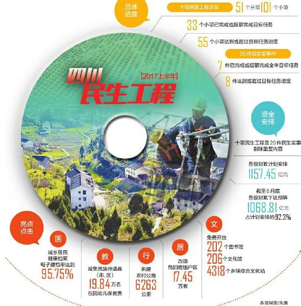 8月初,四川省政府督查室發布上半年四川省民生工程完成情況顯示,上半年十項民生工程涉及的51個分項101個小項中,有33個小項已完成或超額完成目標任務,55個小項達到或超過目標任務進度。20件民生實事中,有7件已完成或超額完成全年目標任務,8件達到或超過目標任務進度。
