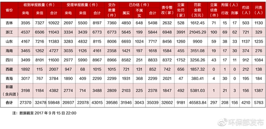 截至2017年9月15日,督察組交辦的環(huán)境舉報(bào),地方已辦結(jié)35039件,辦結(jié)率達(dá)到88.5%。其中,責(zé)令整改32602家;立案處罰9181家,罰款46583.84萬(wàn)元;立案?jìng)刹?97件,行政和刑事拘留364人;約談4210人,問(wèn)責(zé)5763人。