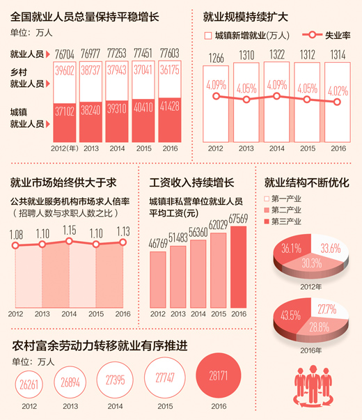 就業規模持續擴大,就業結構不斷優化。看產業分布,服務業成為吸納就業主體。看城鄉分布,城鎮就業人員比重由2012年的48.4%提高到2016年的53.4%,鄉村就業比例降為46.6%,城鄉就業格局發生歷史性轉變。