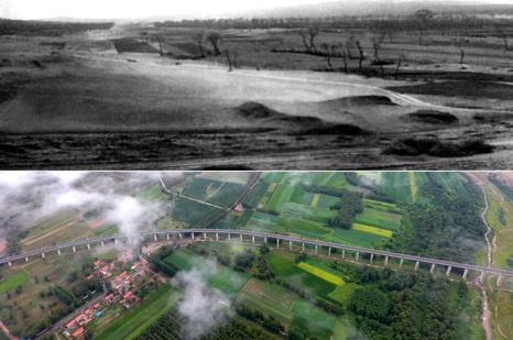 拼版照片:上圖為治理前的山西省右玉縣右衛鎮的景象(資料照片);下圖為現在山西省右玉縣右衛鎮一帶的景象(圖片來源:新華社)。