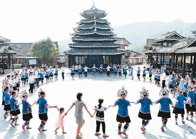 近年來,廣西三江侗族自治縣大力推進(jìn)旅游扶貧工程,將侗族濃郁獨(dú)特的歌舞文化等民俗風(fēng)情轉(zhuǎn)化為招攬游客的“法寶”。圖為在三江侗族自治縣林溪鎮(zhèn)冠洞村冠小屯,人們在歡跳多耶舞。
