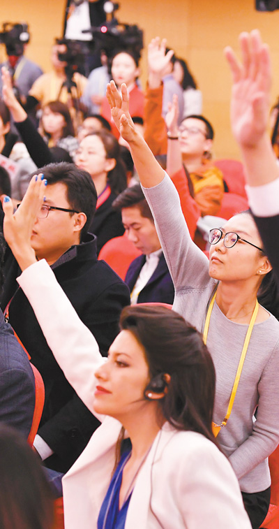 在十九大新聞中心舉行的記者招待會(huì)上,中外記者在提問(wèn)。