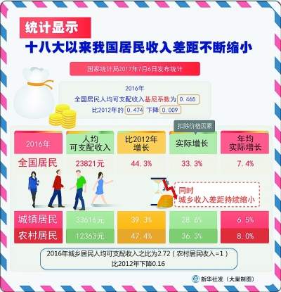 例如,在上世紀90年代和21世紀第一個十年,工資提高和居民收入增長滯后于勞動生產(chǎn)率的提高,其中農(nóng)民收入增長的滯后程度更為明顯,造成這一時期城鄉(xiāng)收入差距擴大、居民收入基尼系數(shù)上升以及勞動報酬在國民收入中的份額下降等不利于收入分配改善的結(jié)果。在此之后,城鄉(xiāng)居民收入增長實現(xiàn)了與勞動生產(chǎn)率提高的同步,甚至一些群體的收入還略快于勞動生產(chǎn)率提高速度。相應(yīng)地,收入分配狀況也開始得到改善。2016年,城鄉(xiāng)收入差距縮小到2.36,基尼系數(shù)下降為0.465。