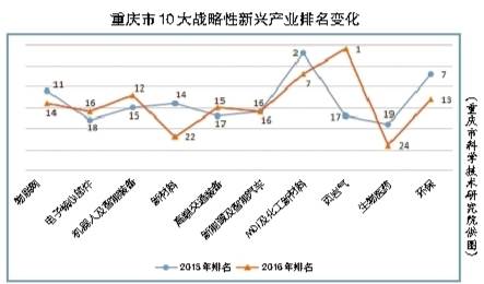 與2015年相比,重慶市10大戰略性新興產業科技競爭力在全國的排名呈上升趨勢:電子核心部件、機器人及智能裝備、高端交通裝備、頁巖氣均排名上升;物聯網、新材料、MDI及化工新材料、生物醫藥、環保排名稍有下降;新能源及智能汽車排名不變。
