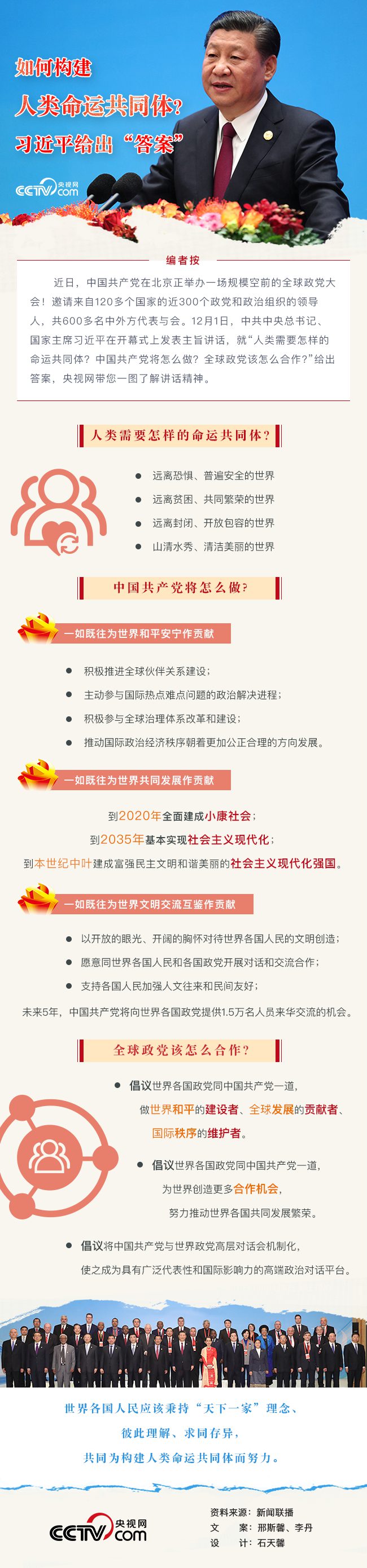 央視網(wǎng)消息:近日,中國共產(chǎn)黨在北京正舉辦一場規(guī)模空前的全球政黨大會!邀請來自120多個(gè)國家的近300個(gè)政黨和政治組織的領(lǐng)導(dǎo)人,共600多名中外方代表與會。12月1日,中共中央總書記、國家主席習(xí)近平在開幕式上發(fā)表主旨講話,就“人類需要怎樣的命運(yùn)共同體?中國共產(chǎn)黨將怎么做?全球政黨該怎么合作?”給出答案,央視網(wǎng)帶您一圖了解講話精神。