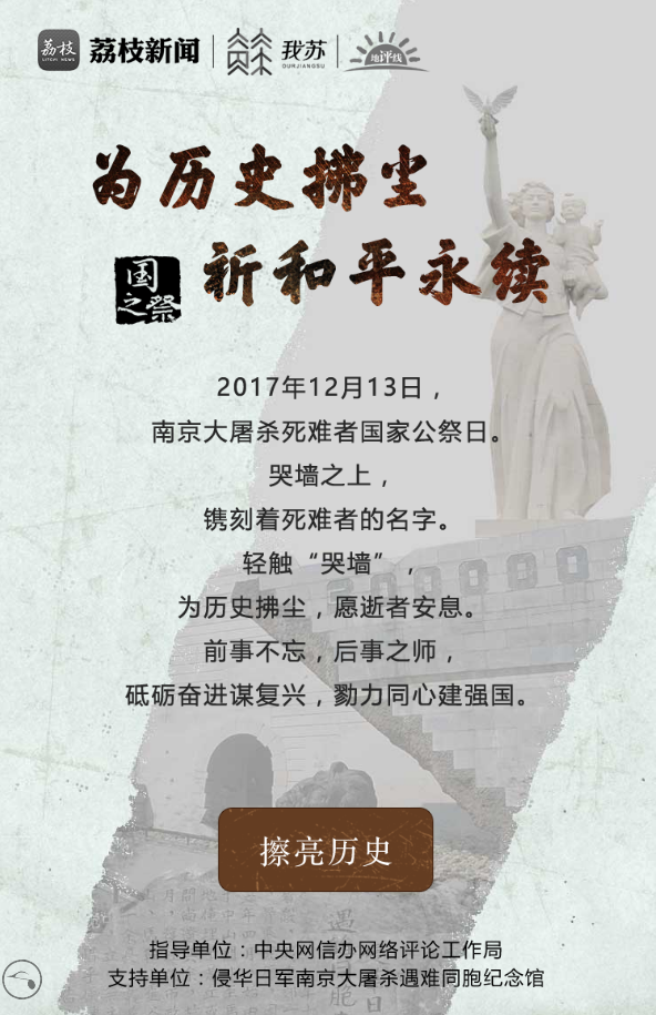 為了永不忘卻的紀念,2017年國家公祭日來臨之際,荔枝新聞和我蘇客戶端推出特別策劃“為歷史拂塵,祈和平永續”互動。愿擦亮的名字守護歷史的真相,愿和平的祈愿溫暖寒冬的殤城。