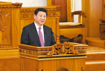 2014年8月22日,國(guó)家主席習(xí)近平在蒙古國(guó)國(guó)家大呼拉爾發(fā)表題為《守望相助,共創(chuàng)中蒙關(guān)系發(fā)展新時(shí)代》的重要演講 (新華社記者 龐興雷 攝)