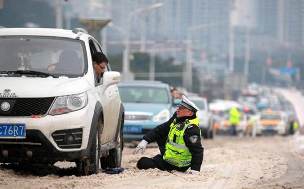 1月25日開始降下的一場大雪,讓湖北省武漢市銀裝素裹,也給交通出行帶來了不小的挑戰。這兩天,一張冰雪里交警跪地、墊衣幫助被困車輛行進的照片,刷爆江城居民的微信朋友圈。許多人點贊:“你看到的歲月靜好背后,離不開他們的默默守護!”