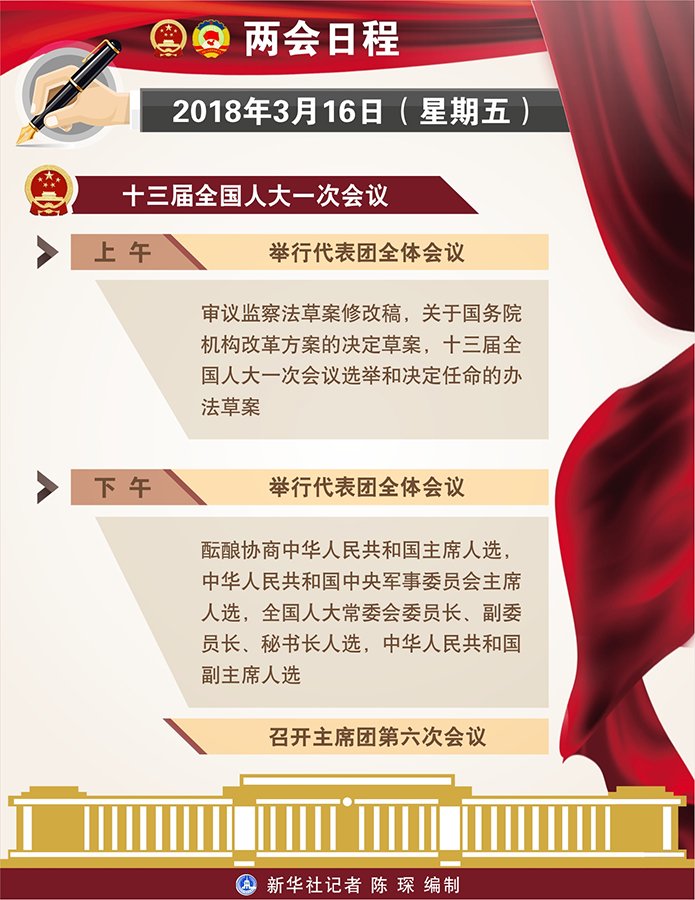 新華社北京3月15日電 十三屆全國人大一次會議16日全天舉行代表團全體會議,上午審議監(jiān)察法草案修改稿,關(guān)于國務(wù)院機構(gòu)改革方案的決定草案,十三屆全國人大一次會議選舉和決定任命的辦法草案;下午醞釀協(xié)商中華人民共和國主席人選,中華人民共和國中央軍事委員會主席人選,全國人大常委會委員長、副委員長、秘書長人選,中華人民共和國副主席人選。下午,召開主席團第六次會議。