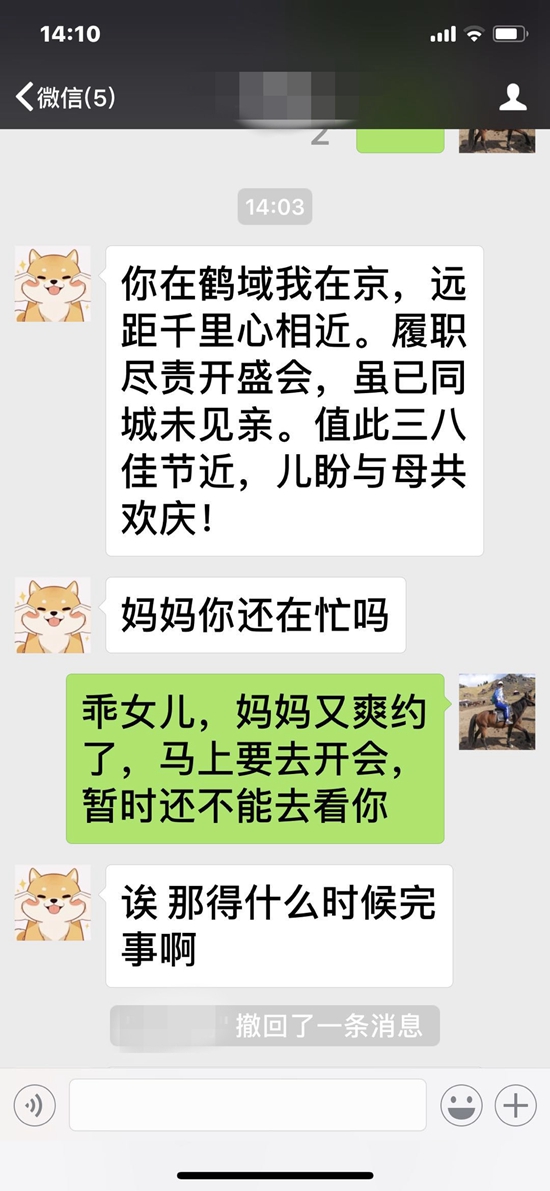 “你在鶴城我在京,遠距千里心相近。履職盡責開盛會,雖已同城未見親。值此三八佳節近,兒盼與母共歡慶!”