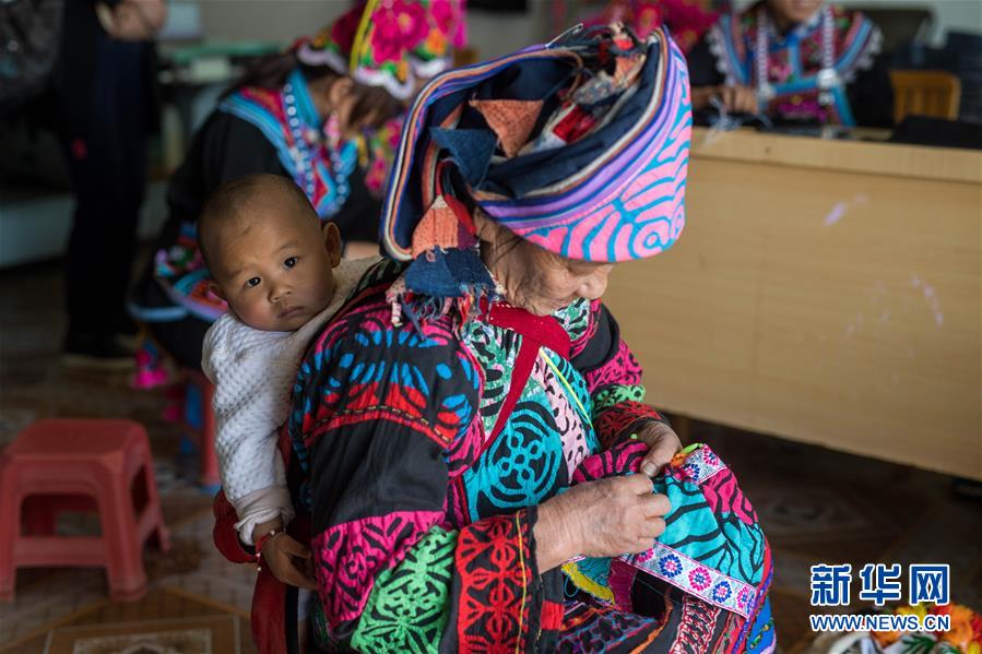 在永仁縣曉麗繡品專業(yè)合作社,一名背著孩子的老人在繡制彝族服飾(4月5日攝)。