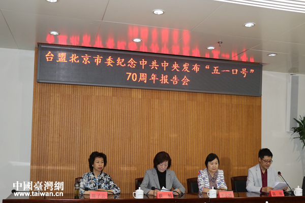 中國臺灣網(wǎng)4月28日訊 (記者 汪明珠)4月28日上午,臺盟北京市委舉辦紀念中共中央發(fā)布“五一口號”70周年報告會。臺盟北京市委副主委蔡勉出席并講話,臺盟北京市委秘書長陳偉主持會議。