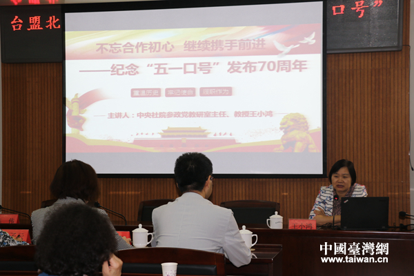 王小鴻作《不忘合作初心 繼續(xù)攜手前進——紀念“五一口號”發(fā)布70周年》專題報告。(中國臺灣網(wǎng) 汪明珠 攝)