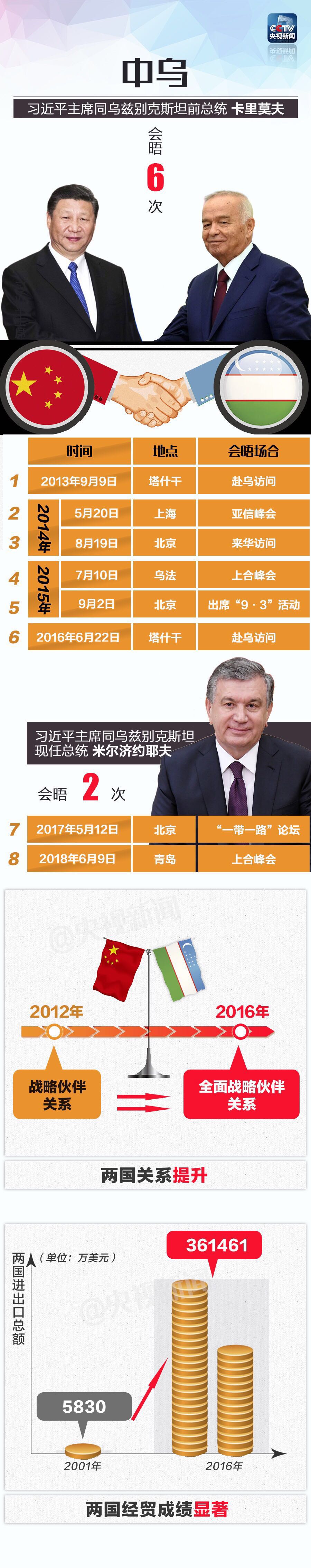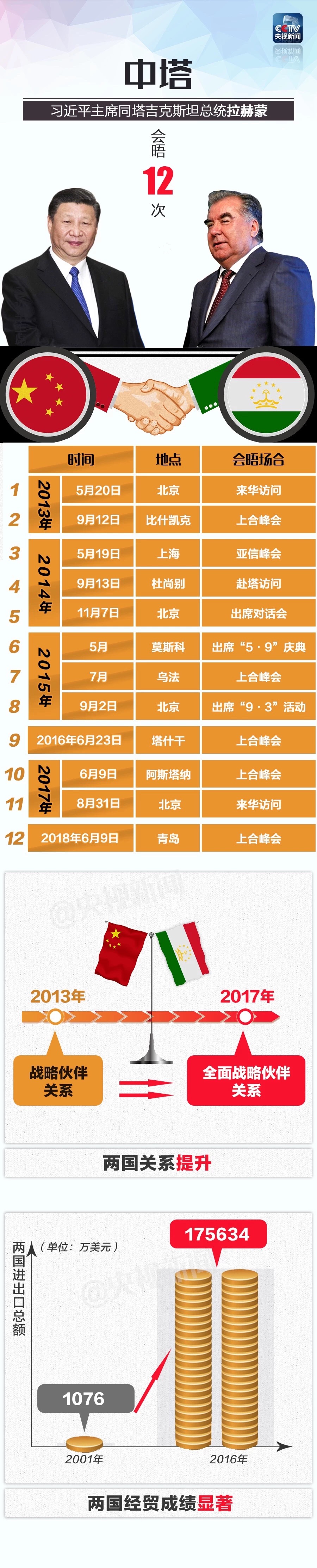 加上此次青島峰會(huì),習(xí)主席與吉爾吉斯斯坦的兩任總統(tǒng)會(huì)晤了9次,與烏茲別克斯坦的兩任總統(tǒng)會(huì)晤了8次,與塔吉克斯坦總統(tǒng)拉赫蒙會(huì)晤了12次。