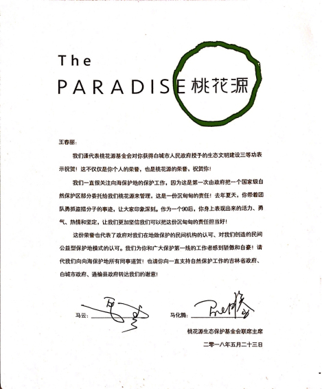 桃花源向海生態保護中心的28歲姑娘王春麗沒有想到,自己居然能夠得到馬云和馬化騰這兩位著名企業家聯合親筆簽名的賀信。日前,“二馬”以桃花源生態保護基金會聯席主席的身份,在信中祝賀她獲得白城市生態文明建設三等功,并感謝她和團隊為向海生態保護做出的貢獻。