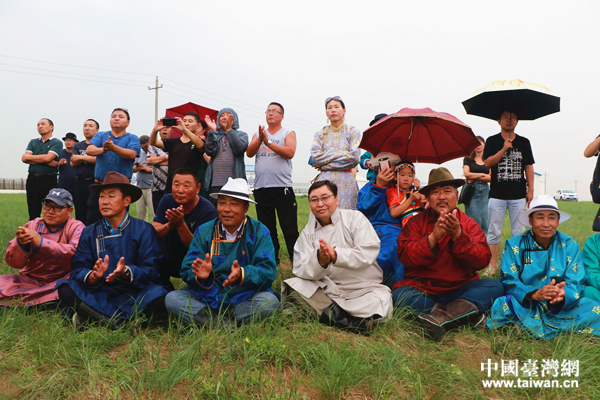 孟克吉日嘎拉(前排穿白色衣服者)與朋友們在草地上打起節(jié)拍。(中國臺灣網(wǎng) 李寧 攝)