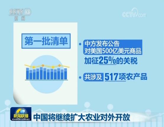 農業農村部副部長韓俊在接受央視記者專訪時表示,在以習近平同志為核心的黨中央的堅強領導下,我們堅決維護國家核心利益,理性處理當前中美經貿問題,在農業領域不得不采取的必要反制措施,是理性和克制的。中國將積極、穩妥、有序擴大農業對外開放。