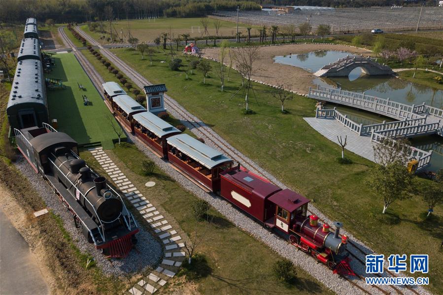 游客乘坐觀光小火車從浙江省安吉縣魯家村的休閑驛站邊駛過(3月23日無人機拍攝)。 新華社記者 黃宗治 攝
