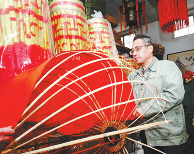 北京市美術紅燈廠工人將紅色布料貼在骨架上。本報記者賀勇攝。