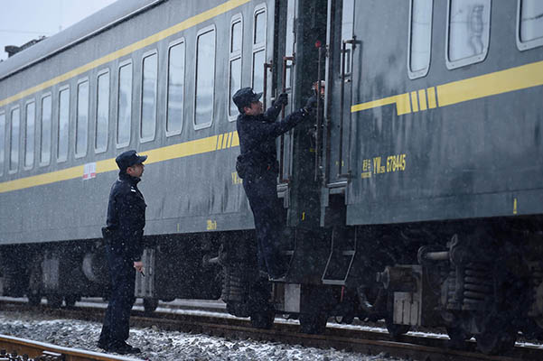 ↑武漢鐵路公安局襄陽公安處民警與鐵路職工對增開旅客列車進行巡查。