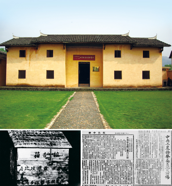 在中央蘇區、延安時期,我們黨探索了一套對蘇維埃政府、邊區政府和革命根據地人民政權組織及其工作人員的監督辦法。 上圖為江西瑞金中華蘇維埃共和國工農檢察委員會舊址;下左圖為當年江西興國縣高興區蘇維埃政府工農檢察部設置的控告箱;下右圖為《紅色中華》報關于中央印刷廠等單位貪污案查處結果和檢舉于都縣蘇維埃工作人員營私貪污案的報道。 中共江西省贛州市委黨史辦供圖