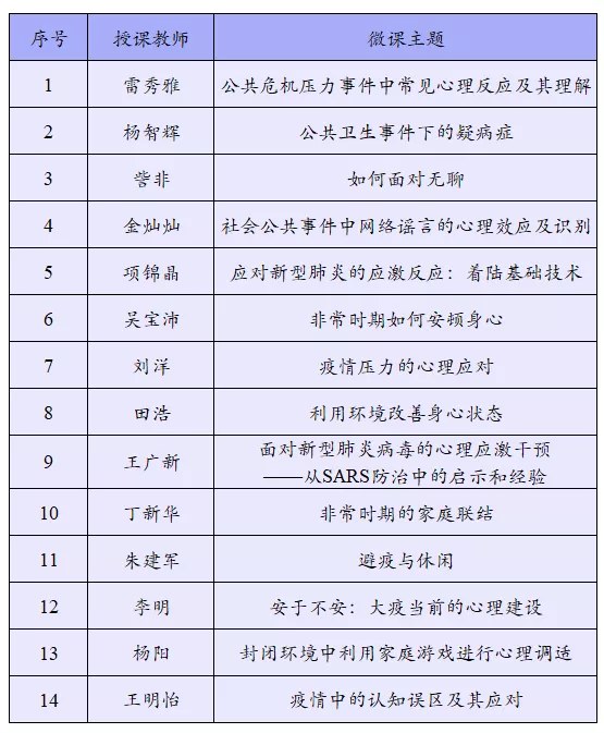 目前已確定的微課講座共計(jì)14講,均由北京林業(yè)大學(xué)心理系教師講授,包括:應(yīng)對(duì)類和相關(guān)知識(shí)類等,詳情請(qǐng)見下表(后期還會(huì)持續(xù)增加新的講座主題,敬請(qǐng)關(guān)注)。