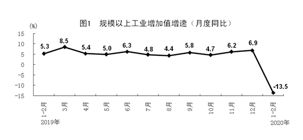 1-2月份,規模以上工業增加值同比下降13.5%。分經濟類型看,國有控股企業增加值下降7.9%;股份制企業下降14.2%,外商及港澳臺商投資企業下降21.4%;私營企業下降20.2%。分三大門類看,采礦業增加值下降6.5%,制造業下降15.7%,電力、熱力、燃氣及水生產和供應業下降7.1%。從產品產量看,醫療防護和生活所需物資增長較快,口罩、發酵酒精產量分別增長127.5%和15.6%,凍肉和方便面分別增長13.5%和11.4%。高技術產品增勢良好,智能手表、智能手環、半導體分立器件和集成電路產量分別增長119.7%、45.1%、31.4%和8.5%;驹牧仙a平穩,生鐵、粗鋼、平板玻璃、十種有色金屬產量分別增長3.1%、3.1%、2.3%和2.2%。全國采購經理調查數據結果顯示,截至2月25日,大中型制造業企業復工率達到85.6%,生產經營活動正有序恢復。