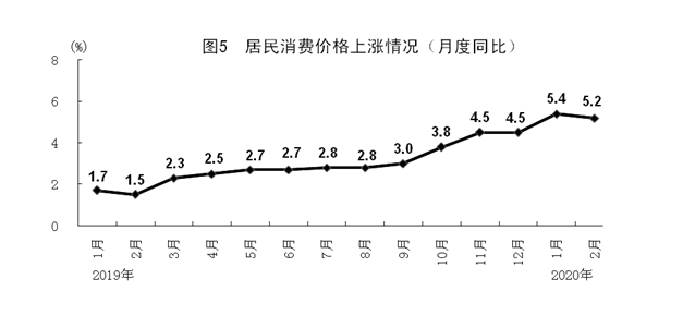 1-2月份,全國居民消費價格同比上漲5.3%。分類別看,食品煙酒價格同比上漲15.6%,衣著上漲0.5%,居住上漲0.4%,生活用品及服務上漲0.1%,交通和通信下降0.4%,教育文化和娛樂上漲1.6%,醫療保健上漲2.2%,其他用品和服務上漲4.6%。在食品煙酒價格中,糧食價格上漲0.6%,鮮菜上漲13.8%,豬肉上漲125.6%,鮮果下降5.3%。扣除食品和能源價格后的核心CPI上漲1.3%。分月看,1、2月份全國居民消費價格同比分別上漲5.4%和5.2%,環比分別上漲1.4%和0.8%。