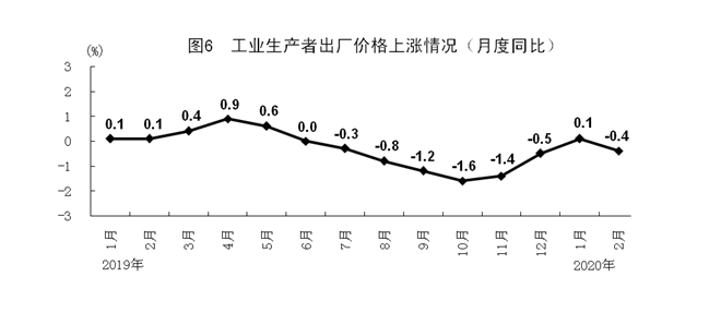 1-2月份,全國工業生產者出廠價格同比下降0.2%。分月看,1月份全國工業生產者出廠價格同比上漲0.1%,環比持平;2月份全國工業生產者出廠價格同比下降0.4%,環比下降0.5%。1-2月份,全國工業生產者購進價格同比下降0.4%。