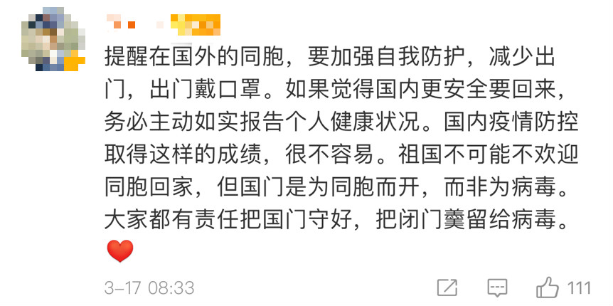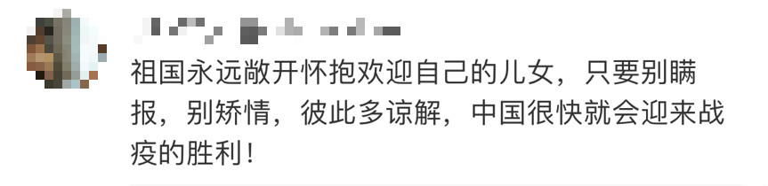 一些網友認為,祖國永遠歡迎自己的兒女回來,但為了防控疫情,歸國人員不應瞞報身體狀況,并要配合國內集中隔離管理。↓↓↓