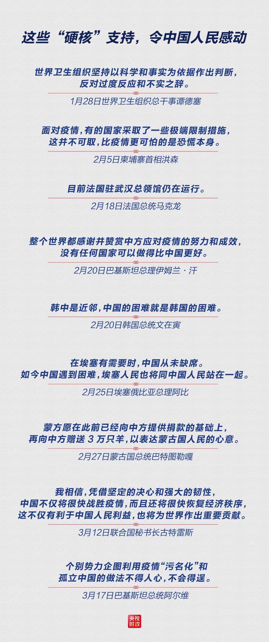 習主席說,人類是一個命運共同體,唯有團結協作才能應對各種全球性風險挑戰。疫情發生以來,中國人民在疫情防控中展現的中國力量、中國精神、中國效率,展現的負責任大國形象,得到國際社會高度贊譽,中國也得到國際社會的寶貴支持。作為同壕戰“疫”的戰友,許多外方領導人向習主席表達“硬核”支持。