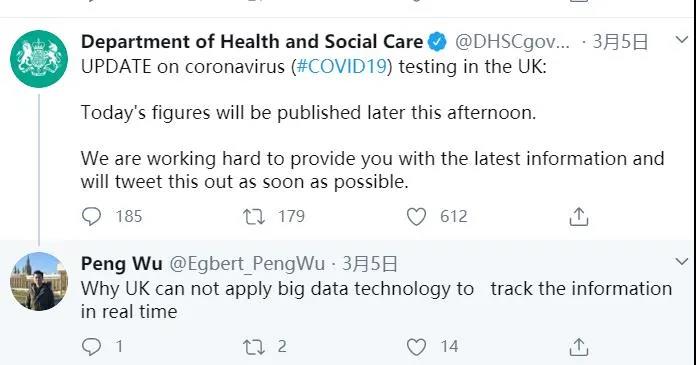 3月5日,英國衛(wèi)生與社會保障部在其官方推特上發(fā)布一條貼文稱,將會努力為網(wǎng)友提供最新的數(shù)據(jù)。英國利茲大學留學的吳芃看到后,在底下留言發(fā)問“為什么英國不能利用大數(shù)據(jù)技術,實時跟蹤信息?”