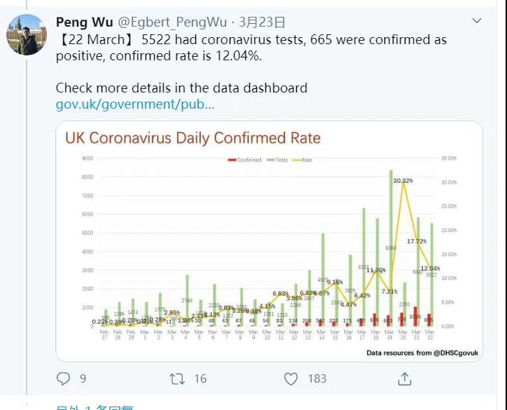《約克郡郵報》稱,他設立了一個通知系統(tǒng),對每天的數(shù)據(jù)發(fā)布進行提醒。他會在政府數(shù)據(jù)出來后很快就發(fā)布自己的圖表。隨著疫情蔓延,他贏得了越來越多專業(yè)人士和社交媒體用戶的稱贊。