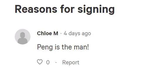 有網(wǎng)友寫請愿簽名的原因時說,因為“吳芃是真男人”。