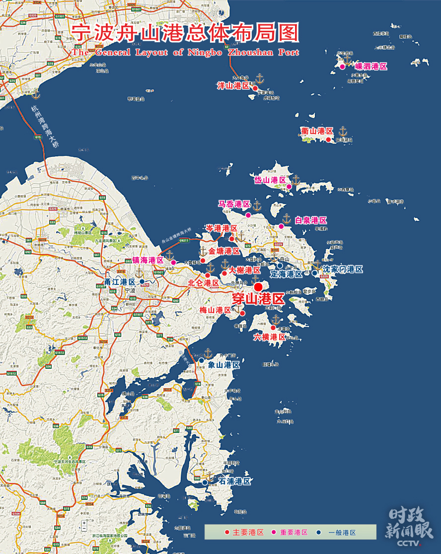 △寧波舟山港由北侖、洋山、六橫、衢山、穿山、金塘、大榭、岑港、梅山等19個港區組成。這是寧波舟山港總體布局圖。(來源于寧波舟山港股份有限公司官網)