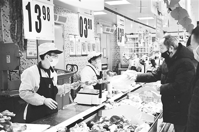近來,各地采取多種措施,在疫情防控期間保障豬肉市場(chǎng)供應(yīng),滿足居民消費(fèi)需求。圖為市民在河南省鄭州市一家大型超市內(nèi)采購豬肉。