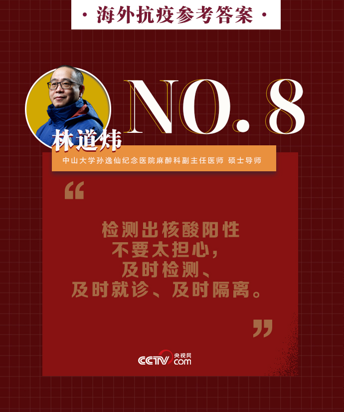 央視網消息:新冠肺炎疫情在全球持續暴發,海外同胞如何做好基本防護、保證自身安全?出現焦慮緊張的負面情緒該如何緩解?中山大學孫逸仙紀念醫院麻醉科副主任醫師、碩士導師林道煒送上硬核攻略:戴口罩、注意手衛生、減少與人接觸。做好這些,新冠病毒不可怕。