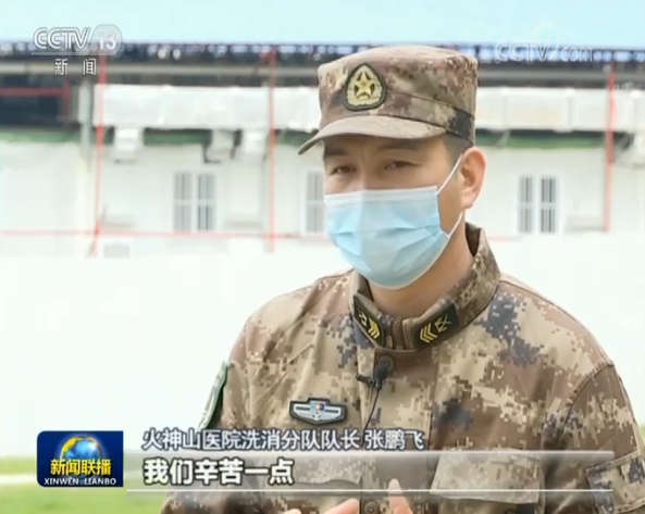 火神山醫院洗消分隊隊長 張鵬飛:我們要保證醫務人員安全,我們要保證病區安全。我們認真一點,我們負責一點,我們辛苦一點,他們就會少一絲隱患。