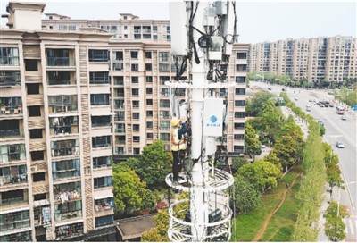 4月8日,106個“新基建”項目在湖南省長沙市天心區集中開工,這些項目涵蓋5G基建、大數據、人工智能等領域,總投資近30億元。圖為工作人員進行5G基站施工。