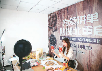 4月12日,在湖北省十堰市鄖陽區電商服務中心“謝謝你為湖北拼單”直播間,主播直播帶貨為農副產品代言。