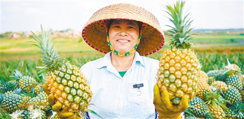 廣東徐聞縣曲界鎮韓宅村村民展示剛采摘的菠蘿。當地是菠蘿生產大縣,村民通過種植菠蘿增收致富。 鄧 華攝(新華社發)