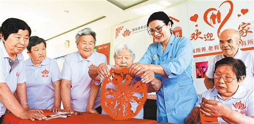 在河北省邢臺市威縣章臺鎮一家養老院,院長楊瑞美和老人一起剪窗花。 朱旭東攝(新華社發)