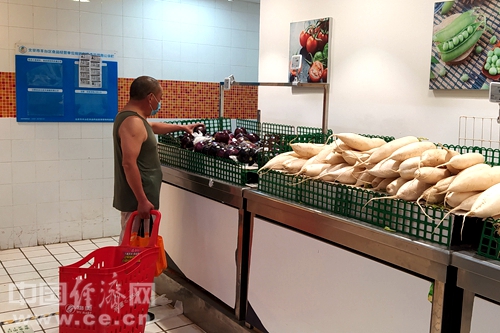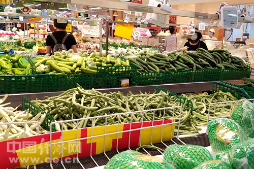 今日,經(jīng)濟日報-中國經(jīng)濟網(wǎng)記者對位于北京南三環(huán)某連鎖超市進行了走訪。在生鮮區(qū)的水果銷售區(qū),包括櫻桃、西瓜、藍莓、荔枝、山竹等各類時令水果整齊排列供人挑選,個別水果還有優(yōu)惠活動。同在該超市的蔬菜區(qū),盡管過了上午買菜的高峰時段,但仍有消費者在挑選蔬菜,除個別特價商品銷售見底外,大部分蔬菜供應(yīng)充足,并有吃過午飯的理貨員在整理菜架,準(zhǔn)備補貨。